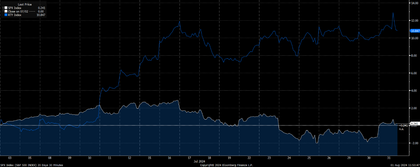 Below is a chart of the Russell 2000 (blue line; representing US Small Caps) vs the S&P 500 (white line; US Large Caps) over the last month, which illustrates close to a 10% performance difference between the two indices.