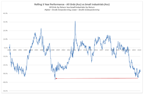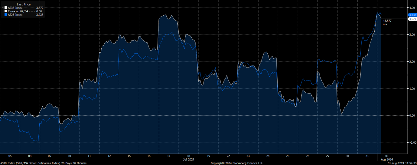 Interestingly, in Australia, we have not yet seen this play out at the index level – with Small Caps (the blue line in the chart below) only slightly ahead vs the ASX100 over the last month.