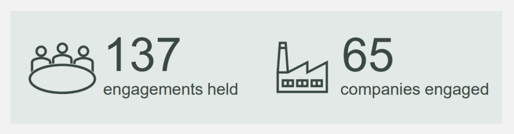 After enhancing the way we structure and track engagements related to ESG issues, 2022 was the first full year of implementation. These changes enabled improved collection of data around the number of meetings, seniority of attendees, and granularity on the topics discussed.