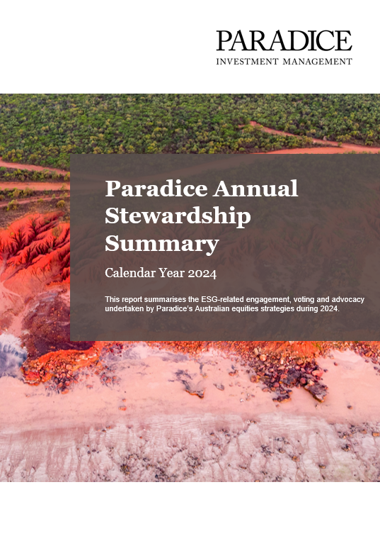 Paradice is pleased to share our annual report summarising the stewardship-related activities undertaken by our Australian equities investment teams in 2024. This includes ESG-related engagement with investee companies, how we exercised our voting rights, and highlights from our advocacy and collaborative efforts.